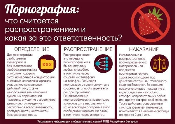 - Изготовление либо хранение с целью распространения или рекламирования, либо распространение или рекламирование порнографических материалов или печатных изданий, изображений, иных предметов порнографического характера, либо публичная демонстрация кино- или видеофильмов порнографического содержания - наказываются общественными работами, или штрафом, или исправительными работами на срок до двух лет, или арестом на срок до шести месяцев.