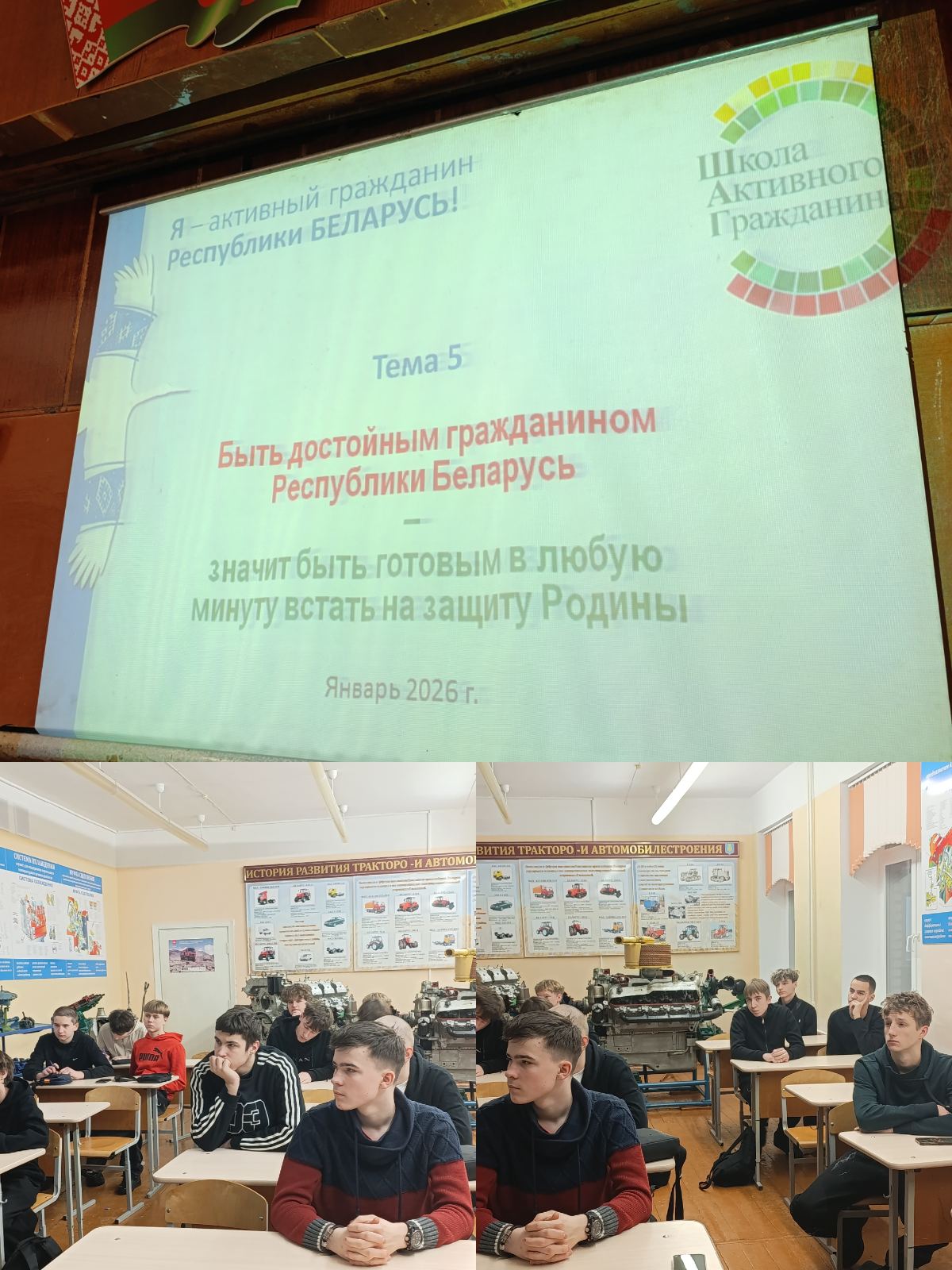29.01.2026г в группах 1 курса прошло мероприятие в рамках ШАГа «Быть достойным гражданином Республики Беларусь – значит быть готовым в любую минуту встать на защиту Родины».