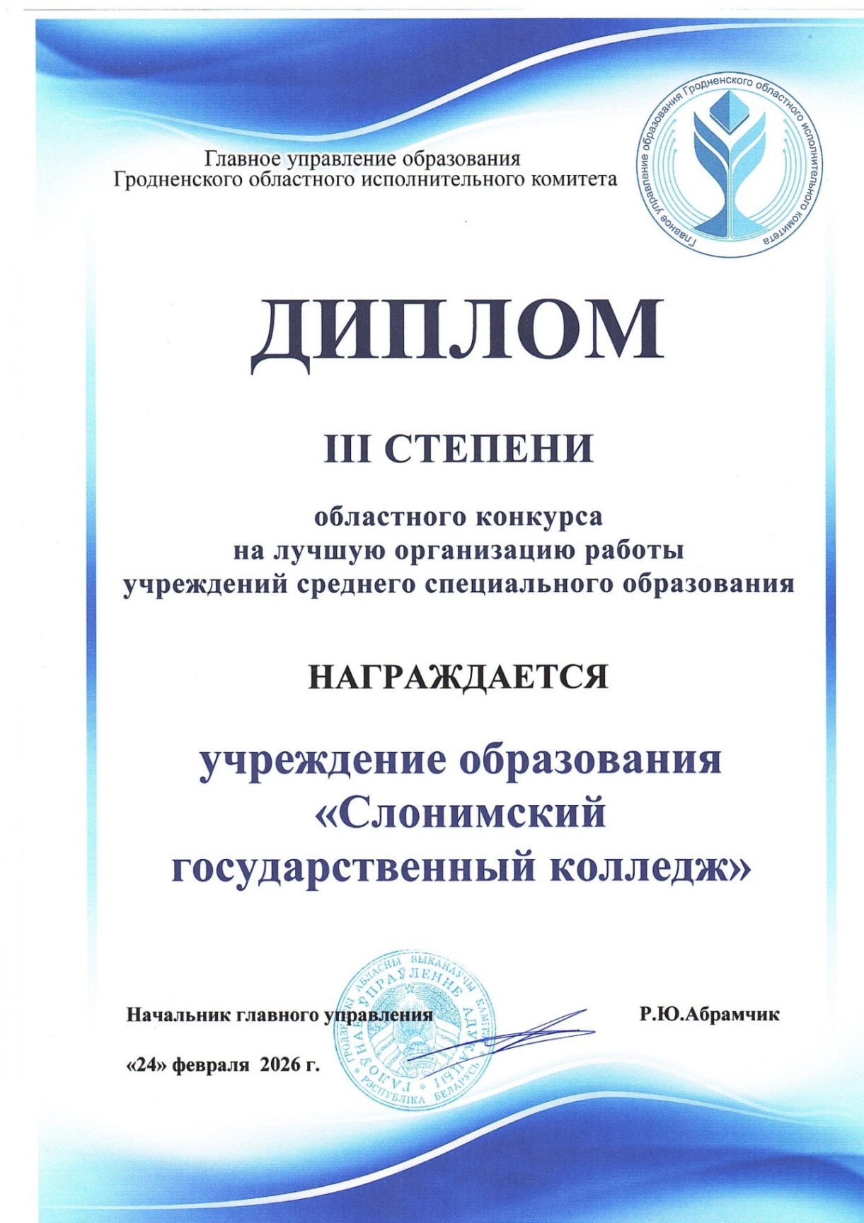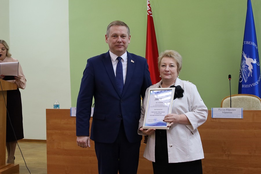 Главным событием встречи стало чествование победителей областного конкурса на лучшую организацию работы учреждений образования. По итогам 2025 года за достижение высоких показателей в развитии образования Диплом III степени был вручен директору УО «Слонимский государственный колледж» Леокадии Брониславовне Юревич.
